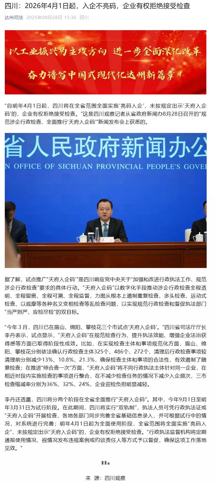 四川:2026年4月1日起,入企不亮码,企业有权拒绝接受检查